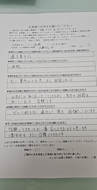 遺言書を作成したことで、B様は 「自分が亡くなった後の相続がスムーズに進む」という安心感を得ることができた とおっしゃっていました。